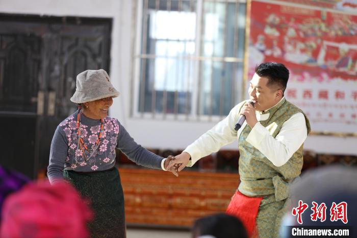 圖為(wei) 演出中,西藏出入境邊防檢查總站文藝骨幹與(yu) 阿裏地區紮西崗鄉(xiang) 群眾(zhong) 互動。 胡俊浩 攝