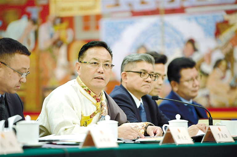 西藏全國人大代表在西藏代表團全體(ti) 會(hui) 議上發言。記者 旦增西旦 攝