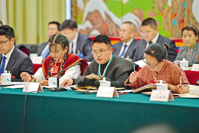 圖為(wei) 西藏全國人大代表紮西江村(右)在西藏代表團全體(ti) 會(hui) 議上發言。旦增西旦 攝