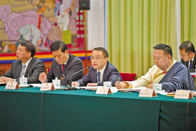 圖為(wei) 西藏全國人大代表王方紅(右二)在西藏代表團全體(ti) 會(hui) 議上發言。