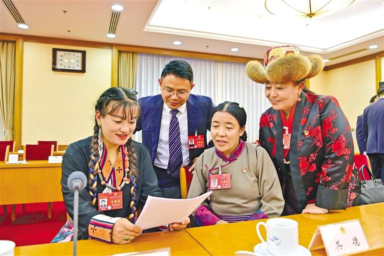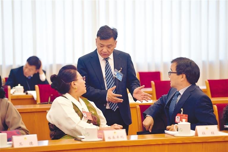 圖為(wei) 西藏全國人大代表在會(hui) 議間隙溝通交流。
