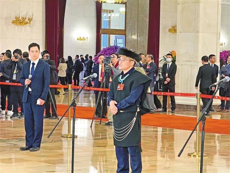 圖為(wei) 西藏全國人大代表紮西江村在“代表通道”回答記者提問。
