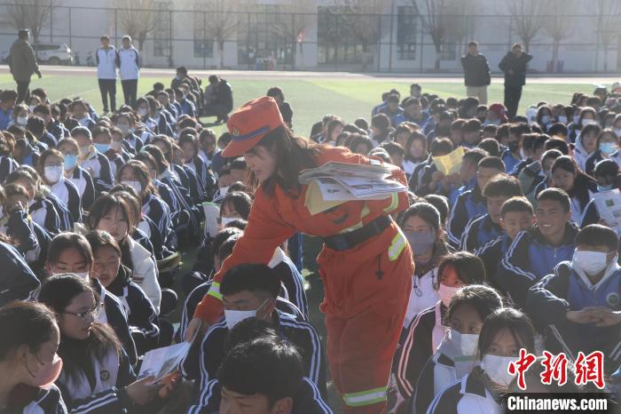 圖為(wei) 消防員向學生發放防火宣傳(chuan) 單。徐靖 攝