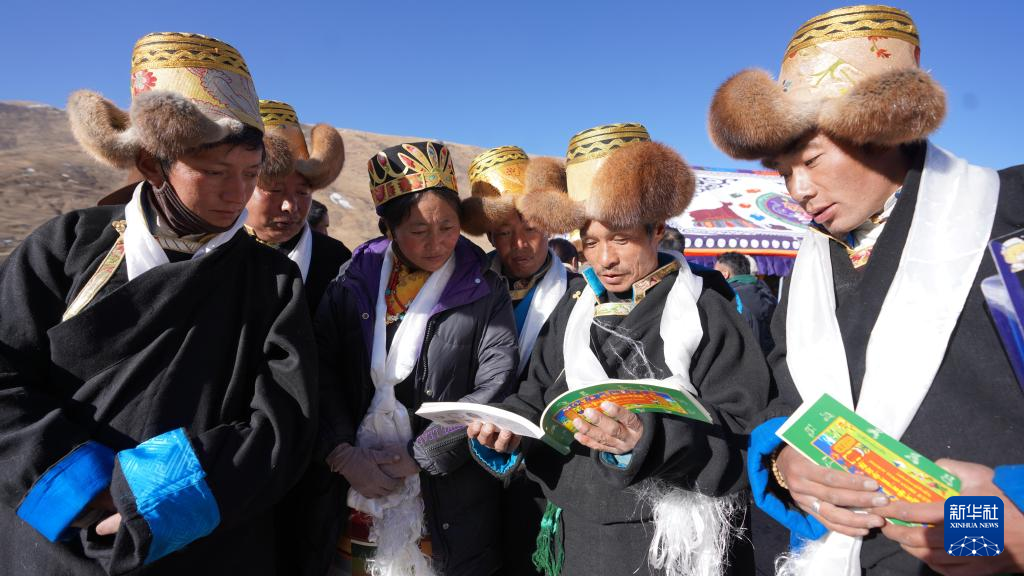 唐加鄉(xiang) 村民在達布天文觀測台旁翻看2024年藏曆(3月9日攝)。(次昂玉珍 攝)