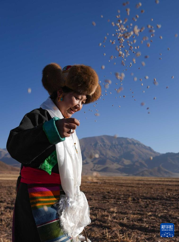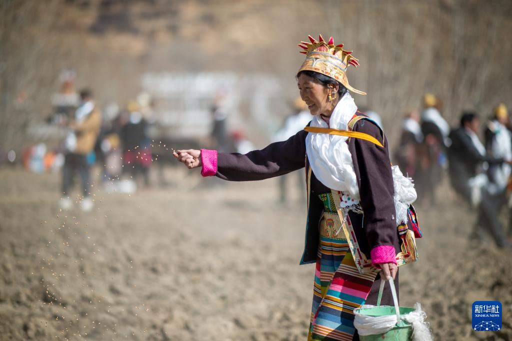 3月16日,在西藏拉薩市林周縣春堆鄉(xiang) 春耕儀(yi) 式現場,農(nong) 民播撒種子。新華社記者 晉美多吉 攝