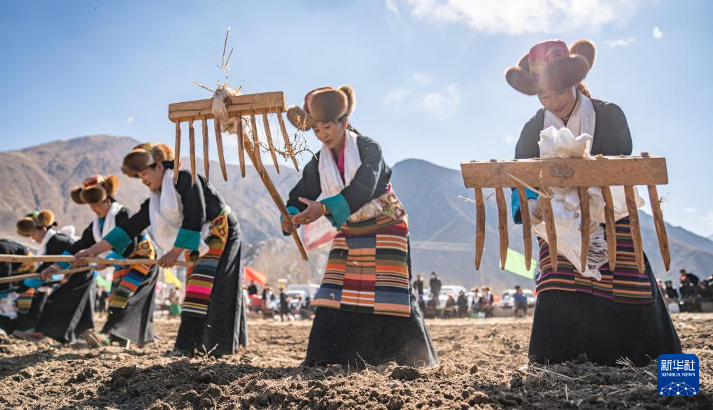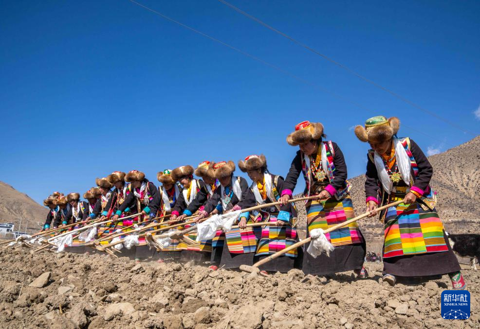 當日是西藏農(nong) 民舉(ju) 行一年一度春耕大典的日子。村民沿襲著傳(chuan) 承千年的春耕民俗,身著節日盛裝,手捧“切瑪”(五穀豐(feng) 登鬥),唱起祈願歌,互敬青稞酒。當鐵犁翻開土地,婦女將手中的種子撒下,祈求新的一年豐(feng) 收。