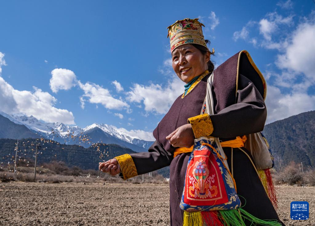 3月16日,在西藏林芝市工布江達縣巴河鎮秀巴村的春耕儀(yi) 式現場,農(nong) 民播撒種子。新華社記者 孫非 攝