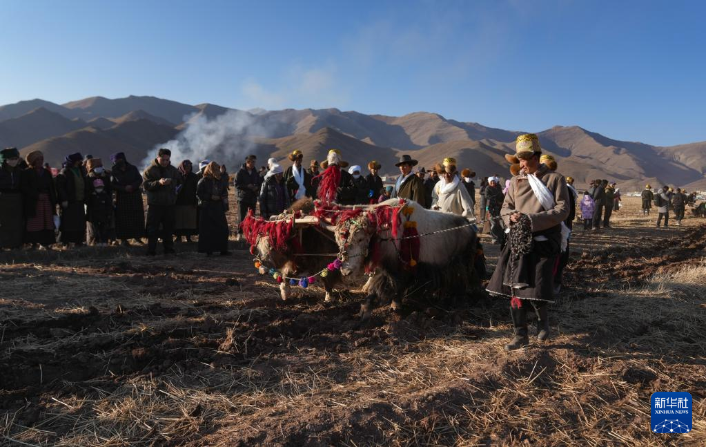 3月16日,在西藏拉薩市林周縣春堆鄉(xiang) 春耕儀(yi) 式現場,農(nong) 民沿襲傳(chuan) 統,使用二牛抬杠翻土犁地。新華社記者 晉美多吉 攝
