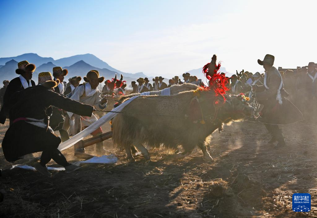 3月16日,在西藏拉薩市林周縣春堆鄉(xiang) 春耕儀(yi) 式現場,農(nong) 民沿襲傳(chuan) 統,使用二牛抬杠翻土犁地。新華社記者 張汝鋒 攝