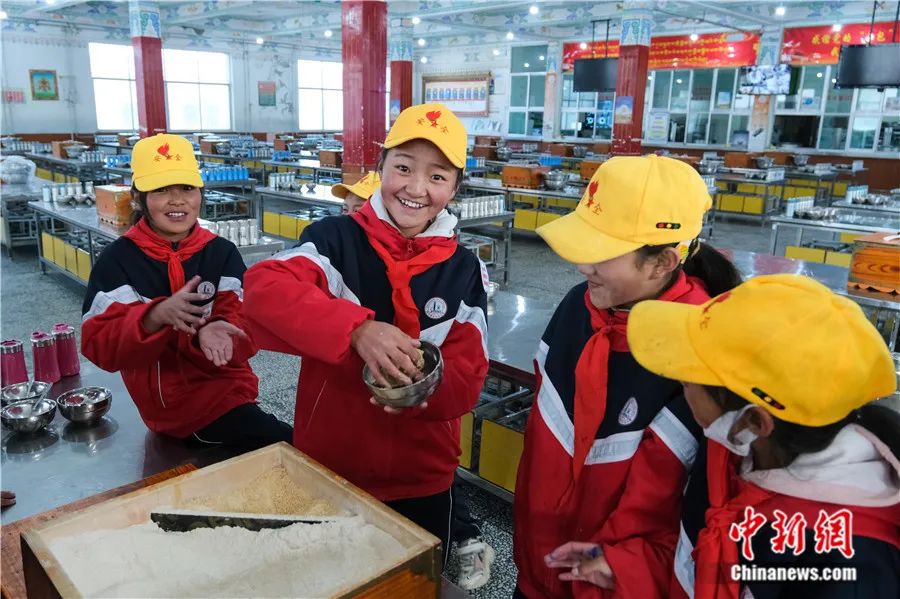 2023年10月13日,班戈縣中石化小學六年級一班尼瑪拉增(左二)在學校食堂捏糌粑,孩子們(men) 說她們(men) 的早餐便是以糌粑為(wei) 主。該校四至六年級多是寄宿製住校生。江飛波 攝