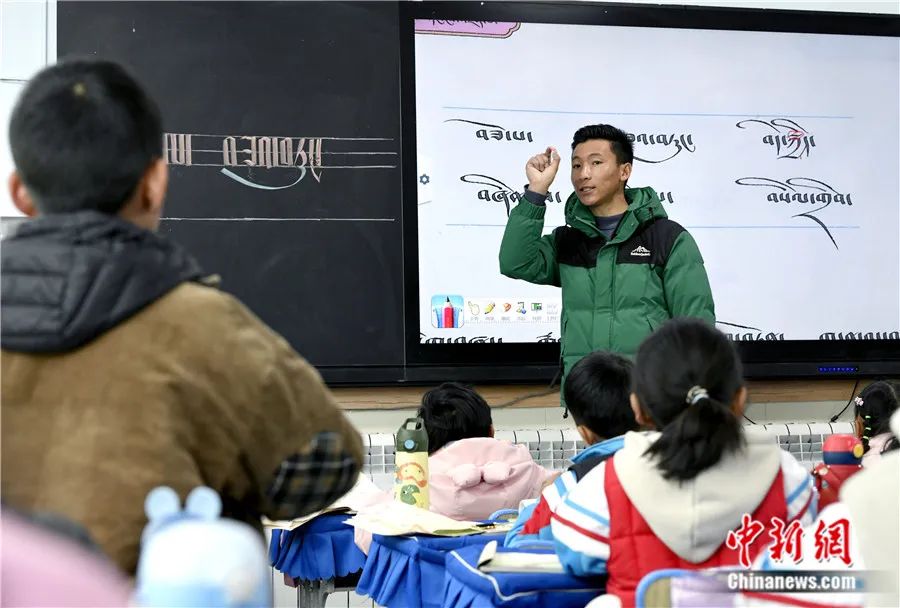 2023年3月14日,西藏拉薩市第一小學藏語文老師拉巴次仁在課堂提問。李林 攝