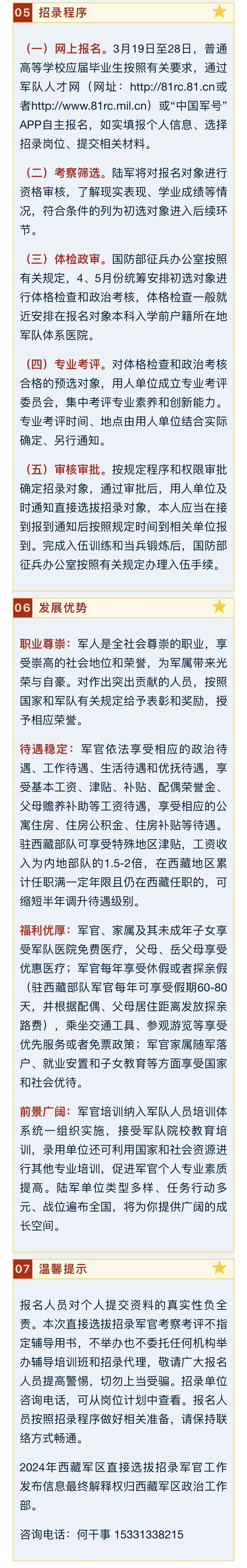 根據軍(jun) 隊有關(guan) 政策規定,按照全軍(jun) 統一部署,現就2024年上半年西藏軍(jun) 區直接選拔招錄軍(jun) 官有關(guan) 事項公告如下: