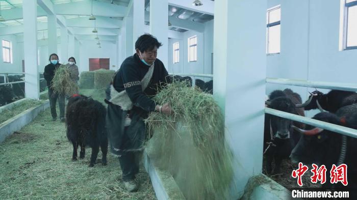 圖為(wei) 多村“一合”牧民聯合專(zhuan) 業(ye) 合作社工作人員給犛牛喂飼料。益西 攝