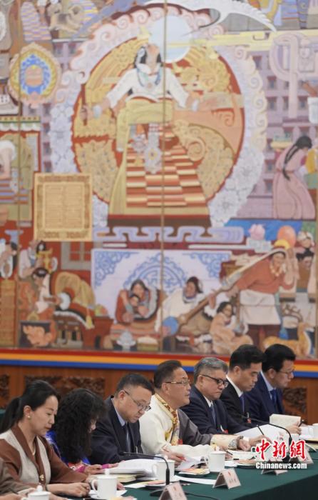 2024年3月6日,出席十四屆全國人大二次會(hui) 議的西藏代表團在北京人民大會(hui) 堂西藏廳舉(ju) 行開放團組會(hui) 議,審議政府工作報告並回答記者提問。崔楠 攝