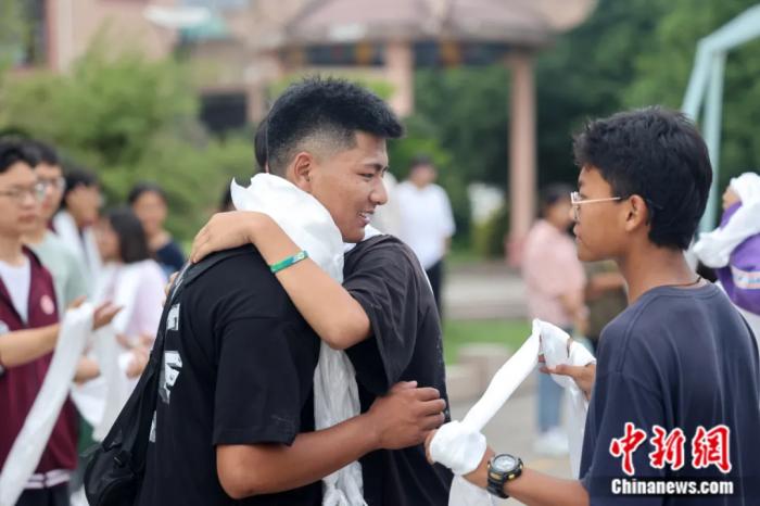 2022年6月,江蘇省南通市,南通西藏民族中學高三畢業(ye) 生在離別前與(yu) 校友告別。徐培欽 攝