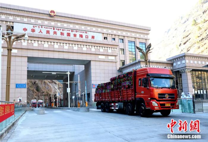 貨車駛入位於(yu) 西藏自治區吉隆縣的吉隆口岸。吉隆融媒體(ti) 中心 供圖