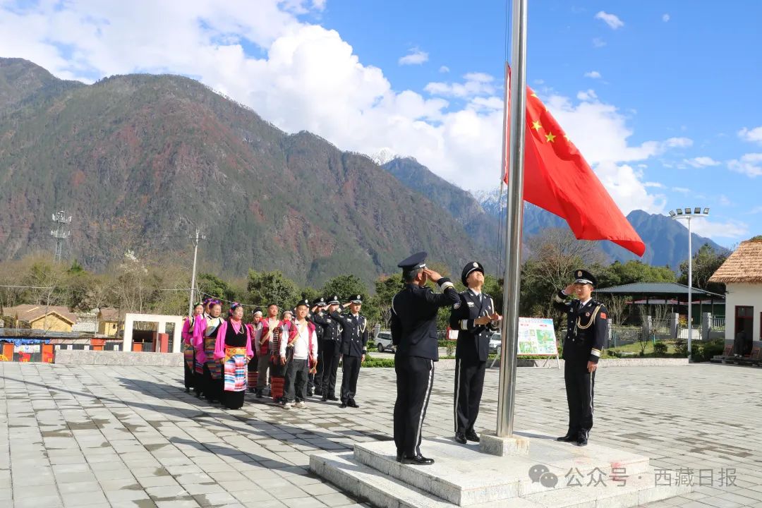 林芝邊境管理支隊竹瓦根邊境派出所與(yu) 轄區幹部群眾(zhong) 舉(ju) 行紀念西藏百萬(wan) 農(nong) 奴解放65周年升旗儀(yi) 式。