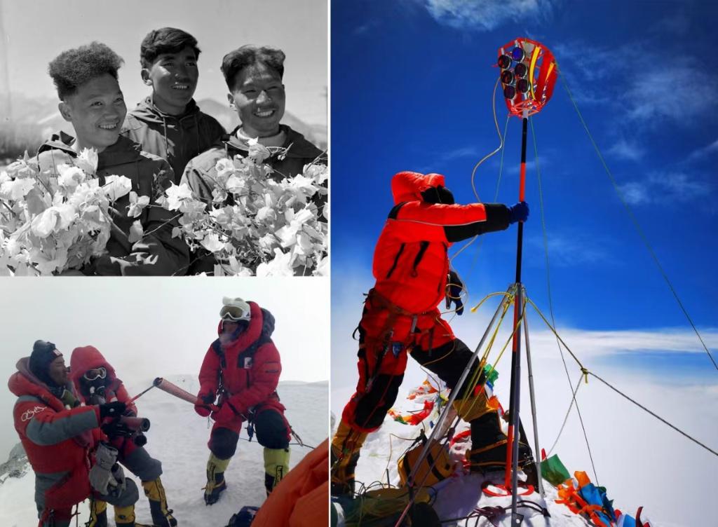 拚版照片:左上圖為(wei) 1960年5月登上珠穆朗瑪峰峰頂的中國登山隊隊員王富洲(右)、貢布(中)和屈銀華(資料照片,新華社發);左下圖為(wei) 2008年5月8日,北京奧運聖火珠峰傳(chuan) 遞登山隊隊員羅布占堆(左)點燃第一棒火炬手吉吉手中的“祥雲(yun) ”火炬(新華社發);右圖為(wei) 2020珠峰高程測量登山隊隊員在珠穆朗瑪峰峰頂開展測量工作(2020年5月27日新華社特約記者紮西次仁攝)