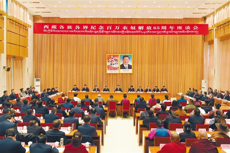 3月28日,西藏各族各界紀念百萬(wan) 農(nong) 奴解放65周年座談會(hui) 在拉薩召開。