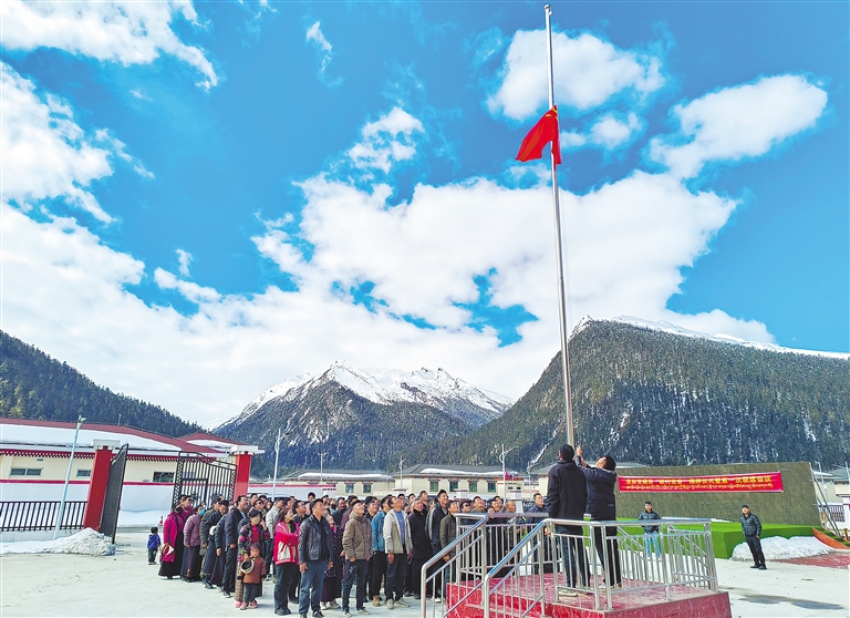 3月28日,米林市裏龍鄉(xiang) 才巴村朗貢搬遷點的群眾(zhong) 舉(ju) 行紀念西藏百萬(wan) 農(nong) 奴解放65周年升國旗儀(yi) 式。周宇 記者 丹增群培 攝