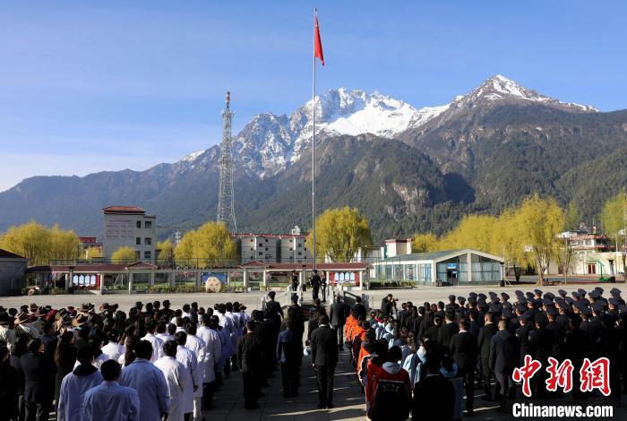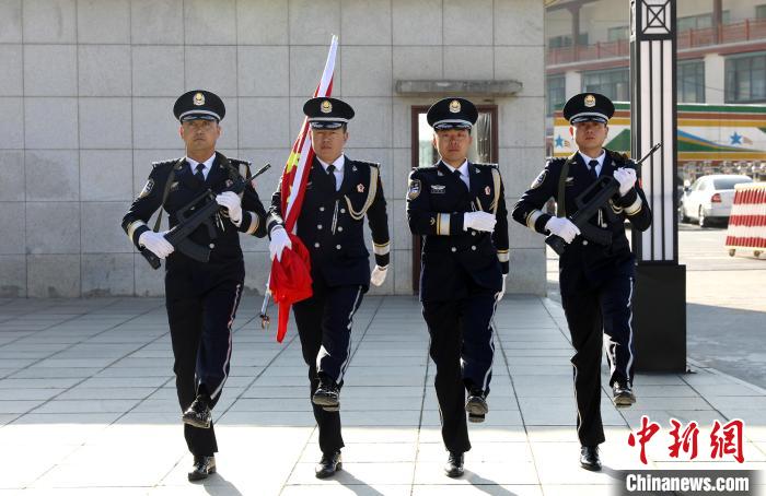 圖為(wei) 吉隆出入境邊防檢查站移民管理警察將鮮豔的五星紅旗護送至升旗台。肖富貴 攝