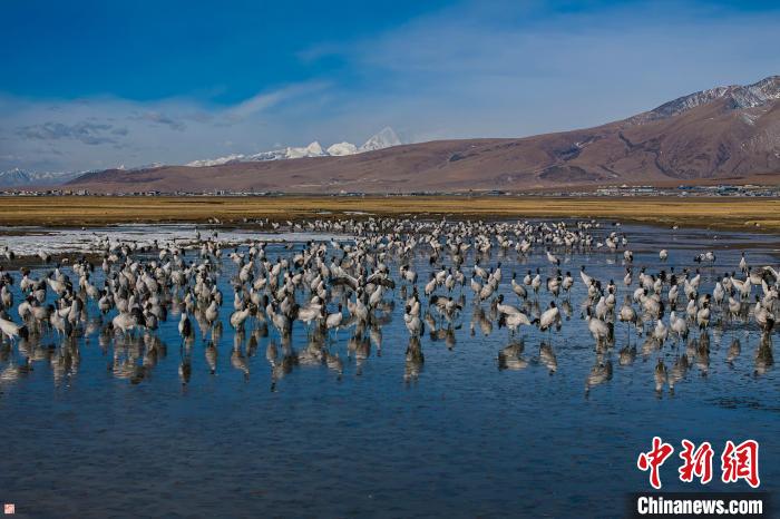 圖為(wei) 拉薩市當雄縣阿熱濕地裏的黑頸鶴。索朗多傑 攝