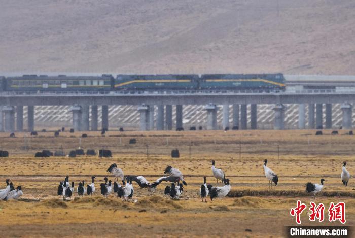 遠處,有火車沿著青藏鐵路鳴笛經過,黑頸鶴們(men) “淡定一瞥”,仿若未聞其聲,繼續欣賞水中的倒影,於(yu) 鳥鳴處處,水聲悠悠間自得其樂(le) 。