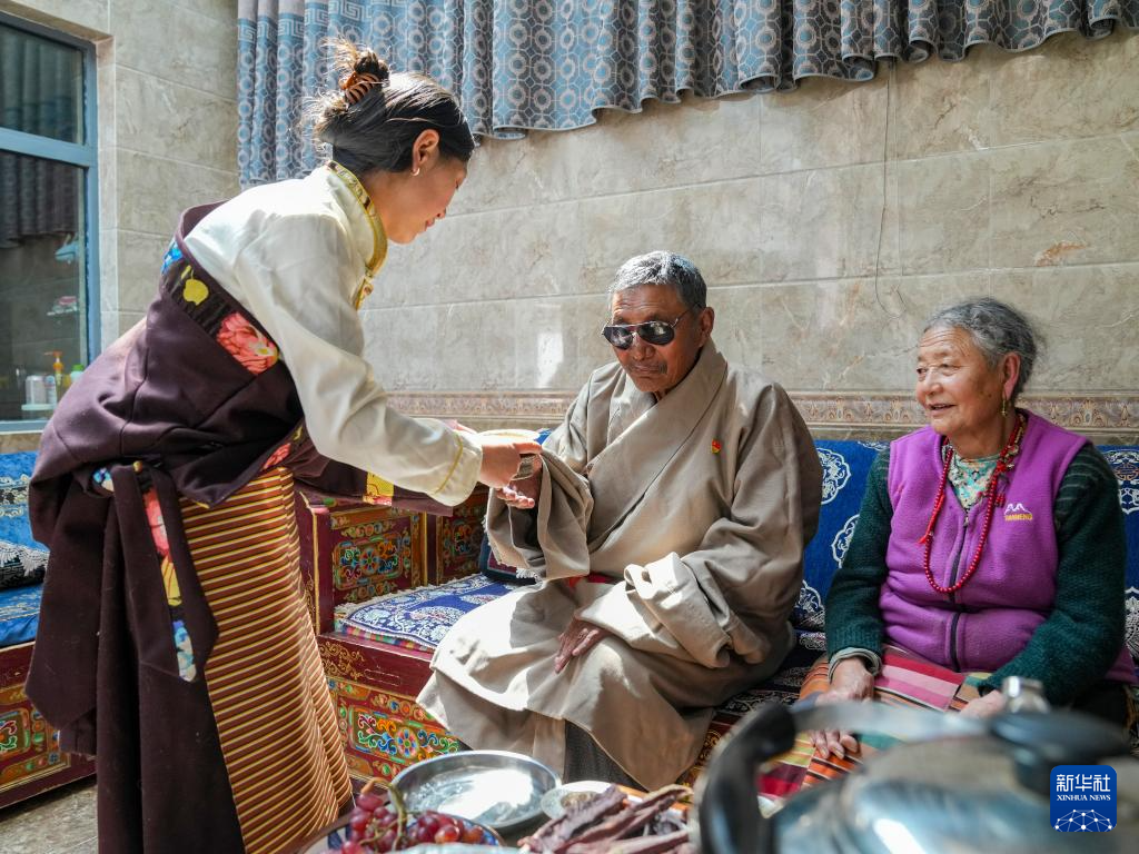 白瑪的孫女嘎桑玉珍(左)為(wei) 他和老伴多吉卓瑪敬酥油茶(3月27日攝)。新華社記者 丁汀 攝