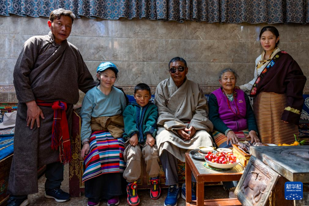 白瑪老人(左四)在家中與(yu) 家人合影(3月27日攝)。新華社記者 薑帆 攝