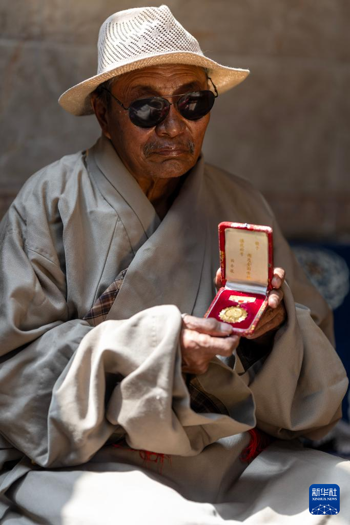 白瑪老人展示自己的全國勞動模範獎章(3月27日攝)。新華社記者 薑帆 攝