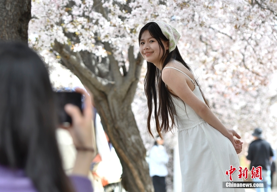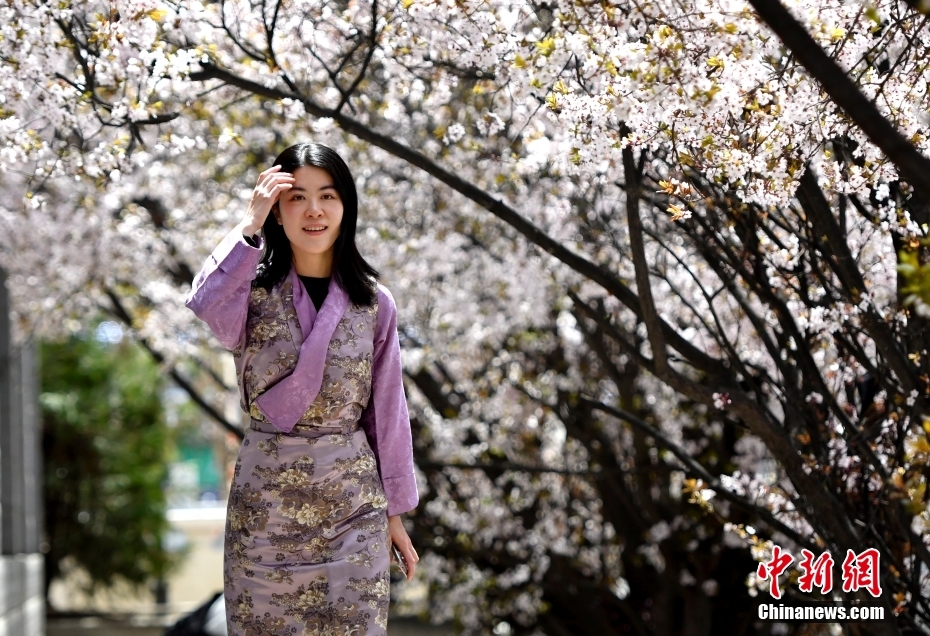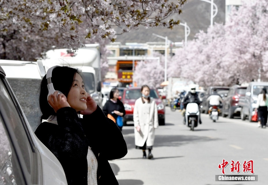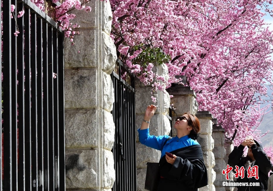 4月1日,市民在春花綻放的道路旁賞花。隨著雪域高原天氣回暖,西藏拉薩市區各條道路春花綻放。因道路兩(liang) 側(ce) 繁華似錦,拉薩市城關(guan) 區軍(jun) 民路成網紅打卡地,市民遊客紛紛前來打卡拍照。中新社記者 李林 攝