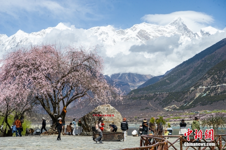 圖為(wei) 遊客在桃花樹下觀賞南迦巴瓦峰美景。中新社記者 貢嘎來鬆 攝