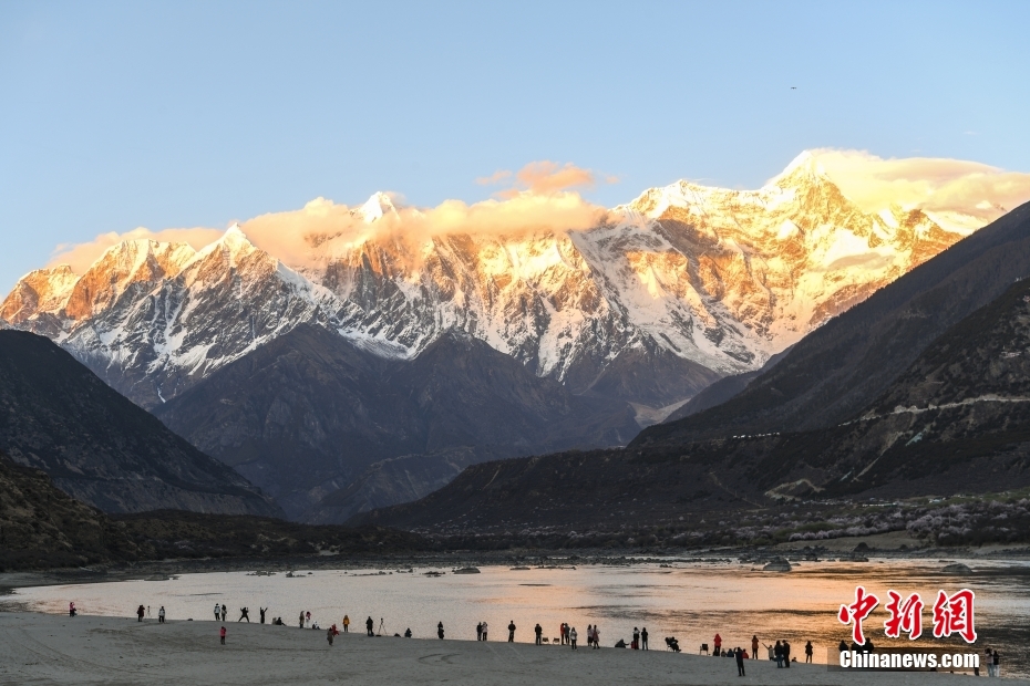 圖為(wei) 遊客在南迦巴瓦峰腳下觀賞“日照金山”。中新社記者 貢嘎來鬆 攝
