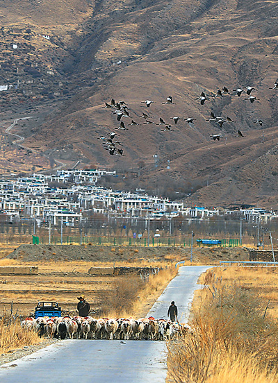 黑頸鶴群飛過西藏山南市貢嘎縣傑德秀鎮村莊和羊群。益西旦增攝