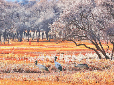 在西藏日喀則市拉孜縣紮西宗鄉(xiang) 沙棘林中覓食的黑頸鶴。益西旦增攝