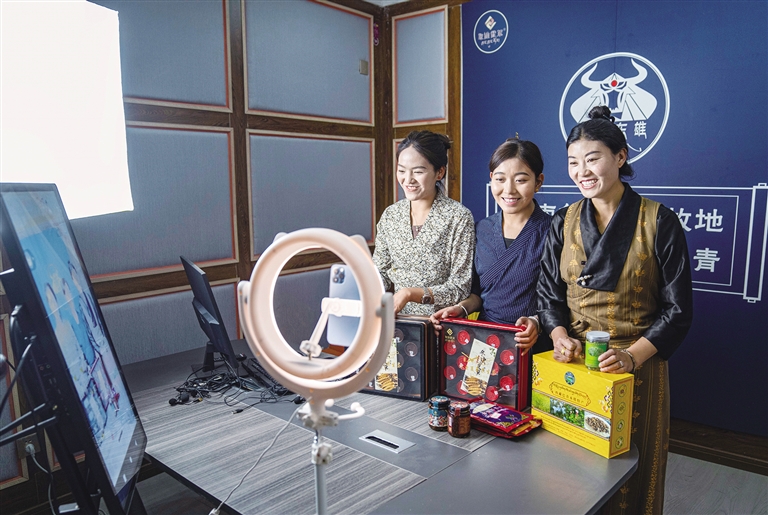 網絡主播在巴青縣“赤堆東(dong) 雄”網紅直播間推介當地特色農(nong) 牧產(chan) 品。 新華社記者 孫非 攝