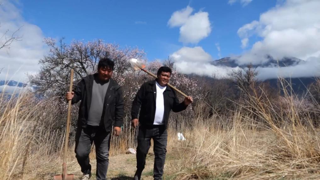 早春,雪域高原逐漸從(cong) 寒冬中複蘇。西藏林芝的山林之中,桃花如雲(yun) 霞般綻放。一片芳菲景象中,新一年的生機與(yu) 繁榮正在孕育。這天一早,羌渡崗村的兩(liang) 名幹部又一次來到了他們(men) 牽掛的村集體(ti) 果園,查看長勢,整理土地。