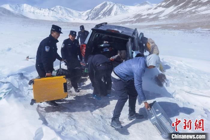 警車出發後行駛約1個(ge) 小時抵達救援現場附近,由於(yu) 道路積雪,事發地海拔超過5300多米,車輛無法繼續前行,民警徒步到達現場,先用便攜式氧氣瓶給高反嚴(yan) 重的遊客供氧。隨後民警對現場進行察看,發現車輛深陷積雪中,靠人力已無法脫困,決(jue) 定先將被困人員及車上貴重物品帶回。