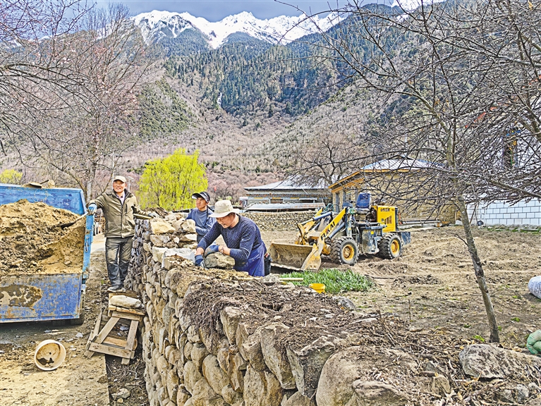 圖為(wei) 村民強巴一家在給果園砌圍牆。
