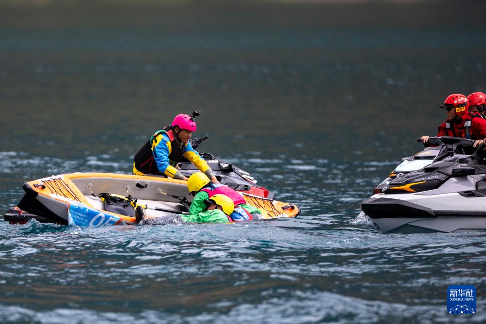 4月20日,救援人員在兩(liang) 人漂流艇競速賽比賽中救起落水的“漂流雜多”隊選手。新華社記者 薑帆 攝