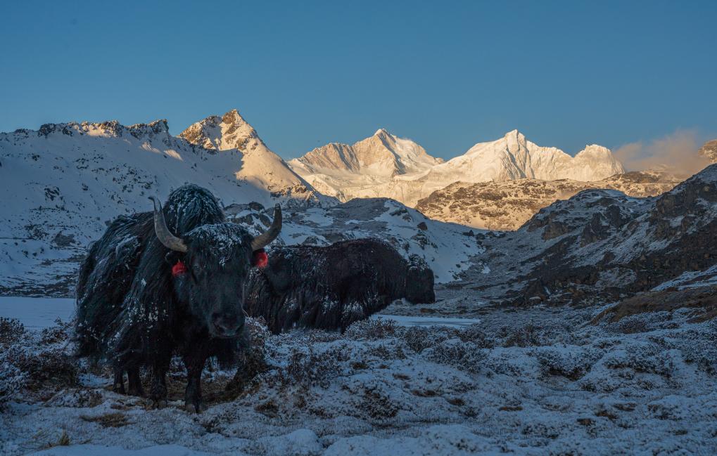 這是在嘎瑪溝中拍攝的犛牛和雪山(4月17日攝)。新華社記者 丁增尼達 攝