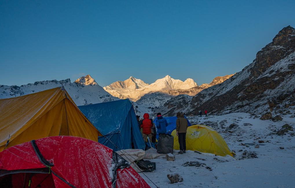 遊客在嘎瑪溝中的曉烏(wu) 措營地觀賞“日照金山”景象(4月17日攝)。新華社記者 楊帆 攝