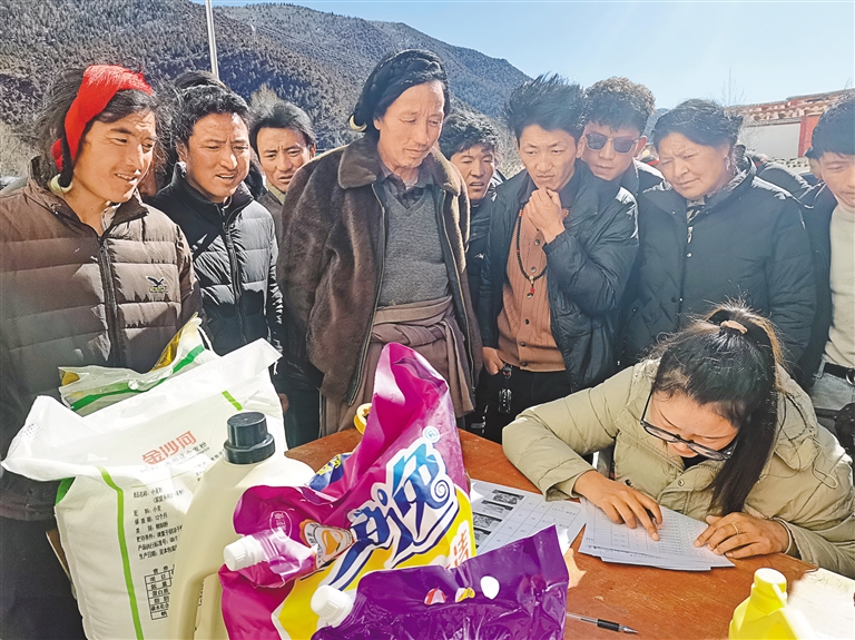 圖為(wei) 芒康縣幫達鄉(xiang) 毛尼村群眾(zhong) 用積分兌(dui) 換生活物資現場。記者 周婷婷 攝