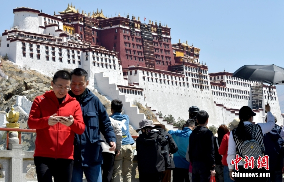 4月23日,遊客在拉薩藥王山觀景台拍照留念。隨著西藏旅遊旺季臨(lin) 近,中外遊客來到雪域高原觀光旅遊。中新社記者 李林 攝
