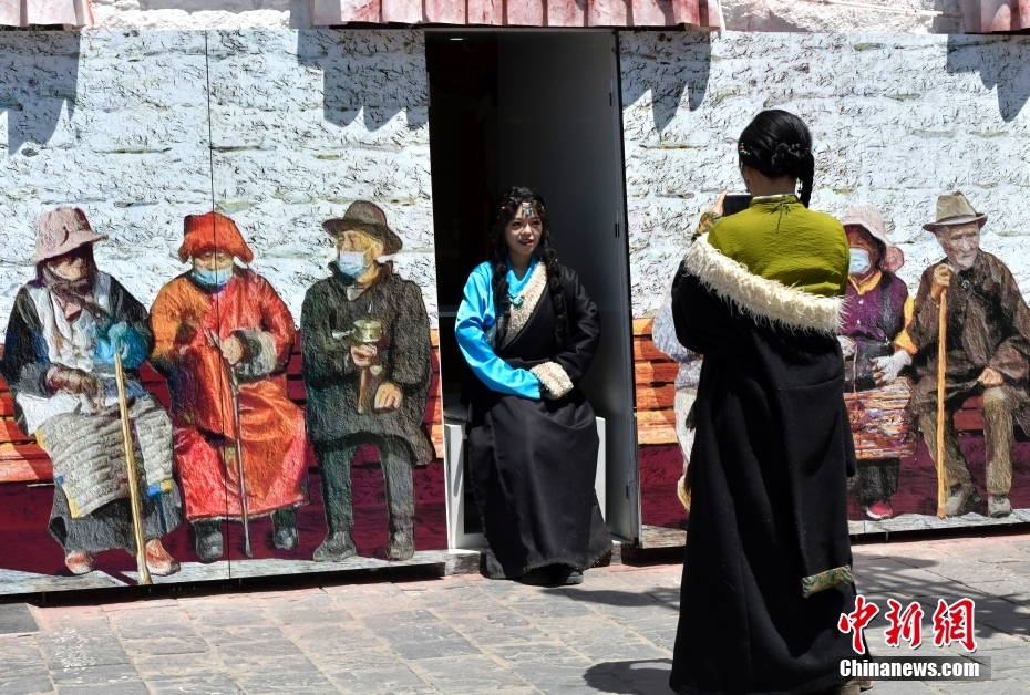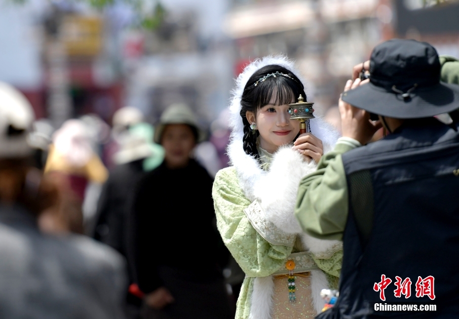 4月23日,身著藏裝的遊客在拉薩八廓街拍照留念。隨著西藏旅遊旺季臨(lin) 近,中外遊客來到雪域高原觀光旅遊。中新社記者 李林 攝