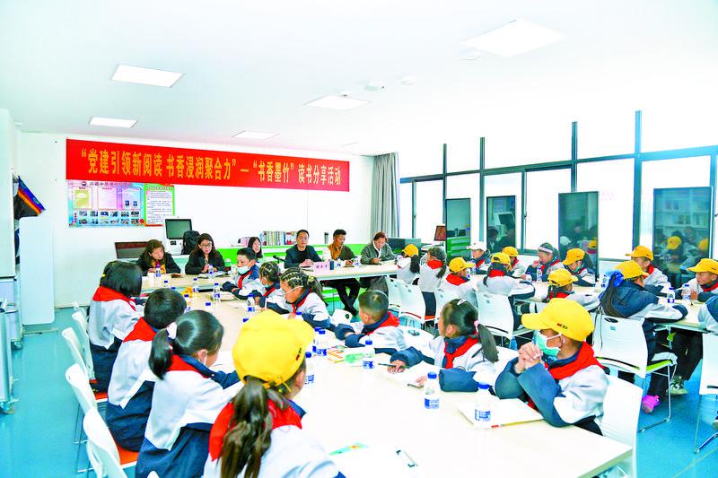 圖為(wei) 拉薩市墨竹工卡縣委宣傳(chuan) 部在該縣南京實驗小學舉(ju) 辦“黨(dang) 建引領新閱讀 書(shu) 香浸潤聚合力”——“書(shu) 香墨竹”讀書(shu) 分享活動。記者 格桑倫(lun) 珠 攝
