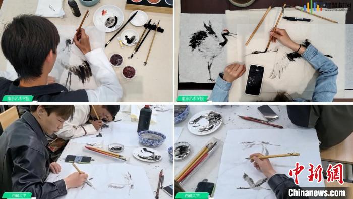 西藏大學藝術學院學生與(yu) 南京藝術學院學生在線上共同繪製黑頸鶴。智慧樹平台供圖