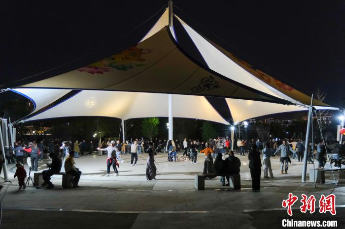 4月26日晚,在拉薩柳梧中心公園跳鍋莊舞的市民,現場熱鬧非常。 中新社記者 江飛波 攝