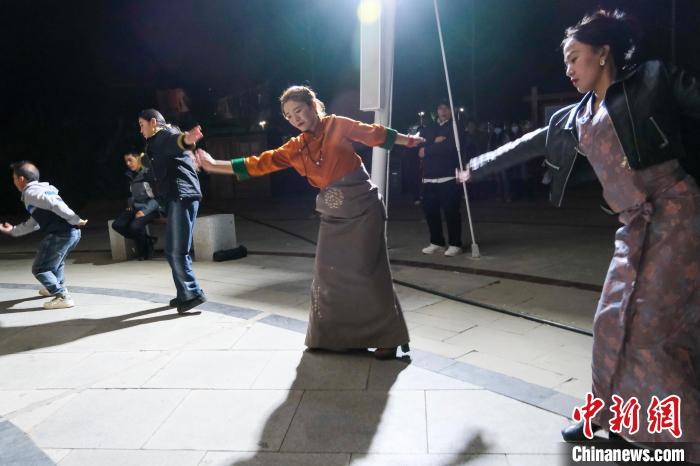 4月26日晚,拉薩柳梧新區的上班族嘎瑪石努(右二)跳夜間鍋莊舞。中新社記者 江飛波 攝