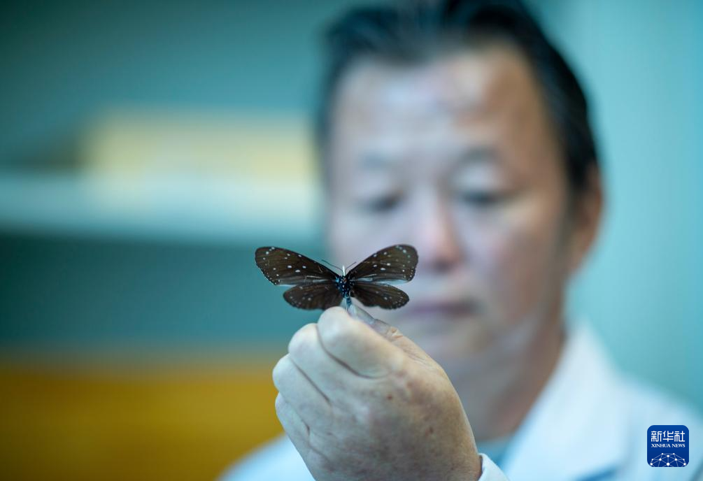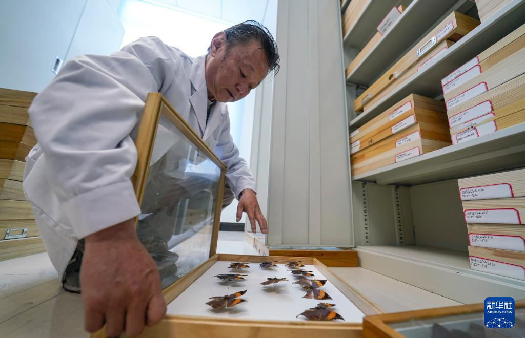 達娃在位於(yu) 拉薩的西藏自治區高原生物研究所展示館藏的蝴蝶標本(4月22日攝)。新華社記者 晉美多吉 攝